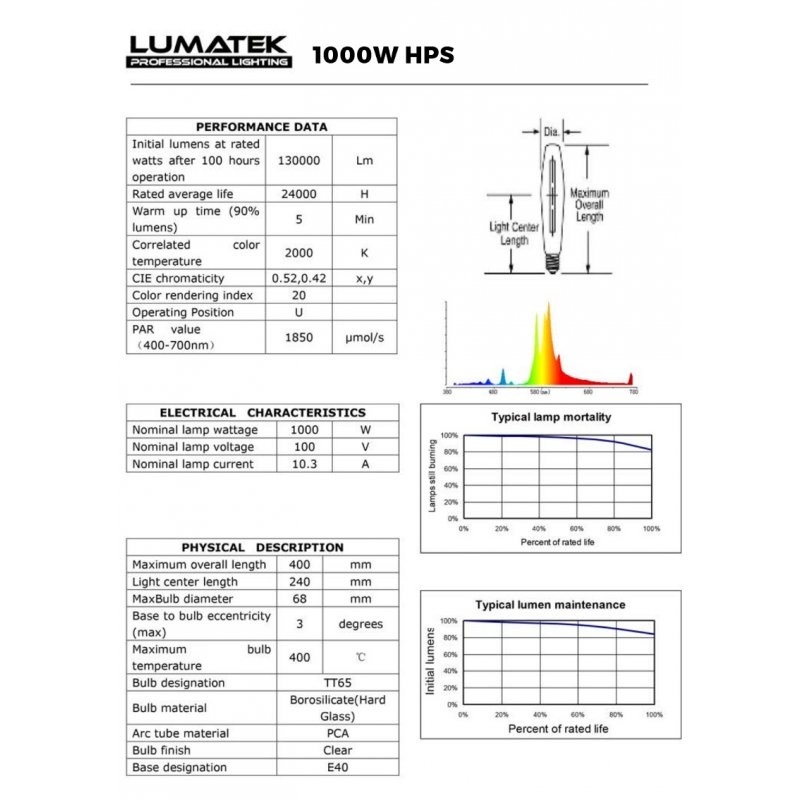 Vysokotolaká sodíková výbojka Lumatek 1000W Dual Spectrum. Světelný tok 130.000 lumenů, životnost 24.000 hodin. Vhodná pro celý život rostliny.