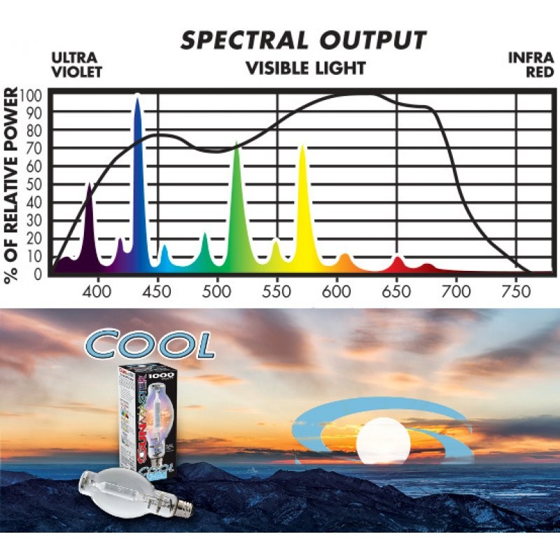 Metalhalidová výbojka Sunmaster Cool 600W MH s modrobílým světelným spektrem podporuje silný vegetativní růst rostlin. Hlavní předností je modrobílé světlo s vysokými hodnotami PAR v modrých a fialových částech světelného spektra.