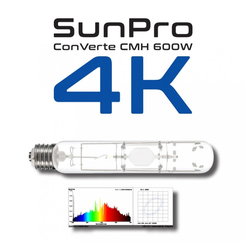 Sunpro ConVerte CMH 600W je vůbec první konverzní LEC lampa, která poskytuje optimální úrovně spektrální energie ve všech fázích růstu rostlin a to jak v růstu, tak i v květu.V případě této výbojky je spektrum specifičtější pro růst(4000 K).