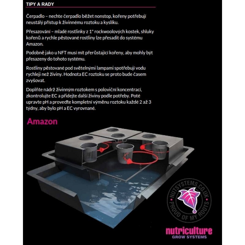 Amazon rostlinu nikdy nepřesytí, ona ví sama nejlépe, kolik živin právě potřebuje. Díky čerpadlu se výživa, která se nespotřebuje a odkape z kořenů nazpátek, využije při dalším krmení.