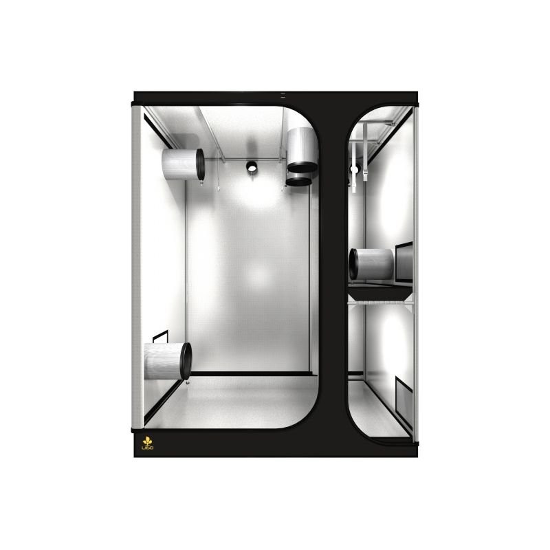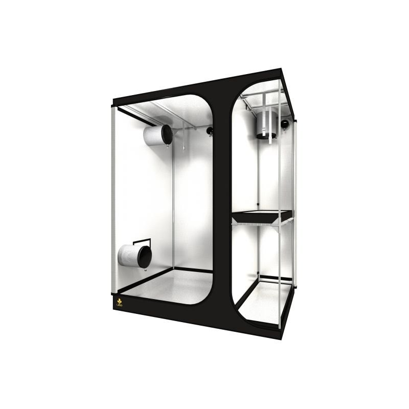 Pěstební stan Dark Room Lodge L160 od Secret Jardin v rozměrech 160x120x205cm s děleným prostorem umožňuje souběžnou kultivaci dospělých i mladých rostlin.