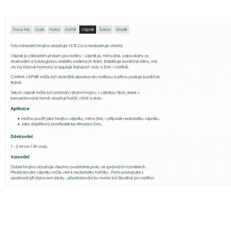 Canna Mono Vápník, Ca 15% lze použít jako vápníkové hnojivo při nedostatku vápníku anebo jako součást doplňkové výživy pro stimulaci růstu. Dostupný v jednolitrovém balení. Využitelný po celou dobu života rostliny.