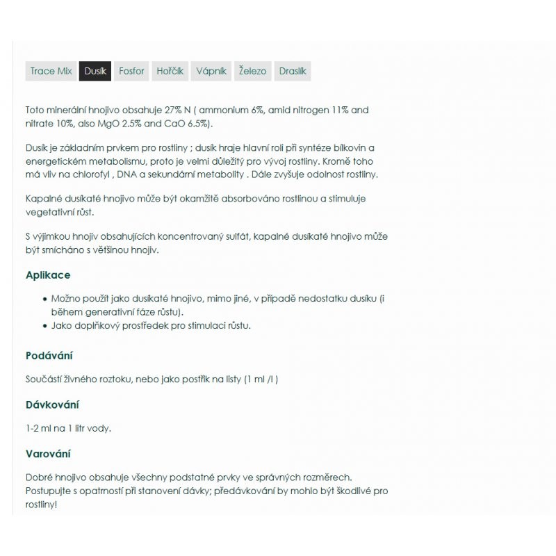 Dusík je jednou z nejdůležitějších součástí rostlin a jejich výživy. Hraje zásadní úlohu při metabolismu a proteinové syntéze. Tekutý Canna Mono Dusík je dodatečný zdroj dusíku při jeho nedostatku.
