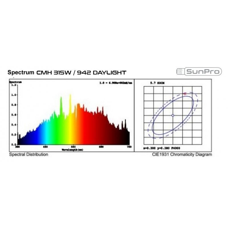 Výhodou je nízká spotřeba, Vegagreen stínidlo s 95% odrazivostí a velmi vysoká životnost. SunPro Complete Fixture 315W umožňuje flexibilní svícení s výbojou CMH 315W/942 Daylight (teplota chromatičnosti 4200 K) je optimalizována v širokém spektru růstového světla a nabízí zvýšený podíl modrého světla. Je vhodná zejména pro fázi růstu, ale díky velmi komplexnímu světelnému spektru je možné její využití pro celou dobu jednoho cyklu.