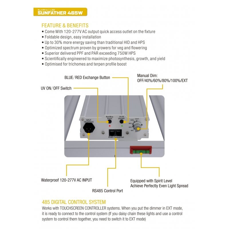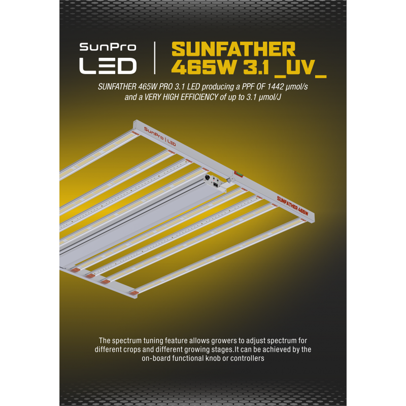 SunPro SUNFATHER 465W je nejnovější LED osvětlení s možností úpravy světelného spektra pro různé druhy rostlin a jejich různé cykly.