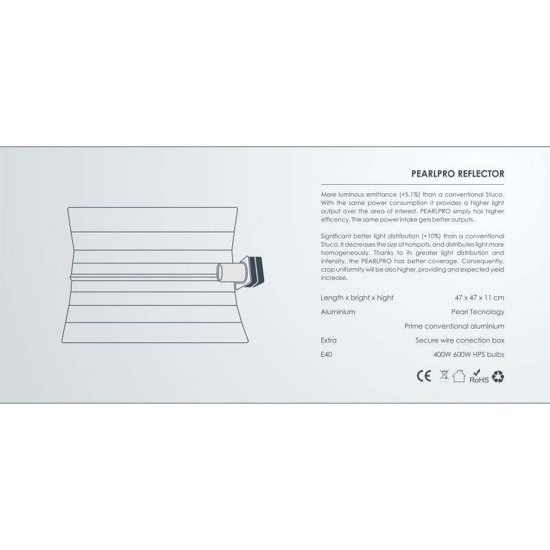 PearlPro je stínidlo vyrobené z hliníku prémiové kvality. Proto poskytuje lepší rozptyl světla při osvětlení rostlin. Pearl technologie má vysokou odrazivost světla cca 90% (několikanásobně lepší než má např. Stucco). Nepodporuje vznikání hotspots, horkých míst pod světelným zdrojem.