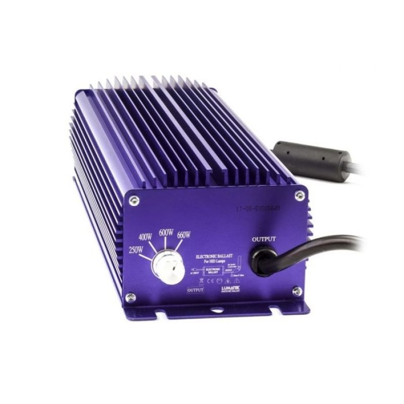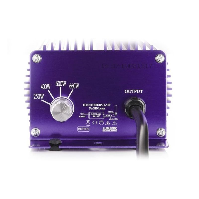 Druhá generace kvalitního předřadníku Lumatek se čtyřpolohovou regulací světelného výkonu v rozpětí 250-400-600-660W. Úroveň SuperLumen se doporučuje používat až při poklesu standardního výkonu výbojky v čase.