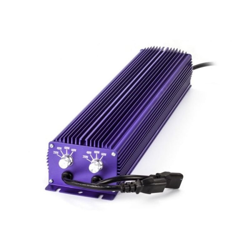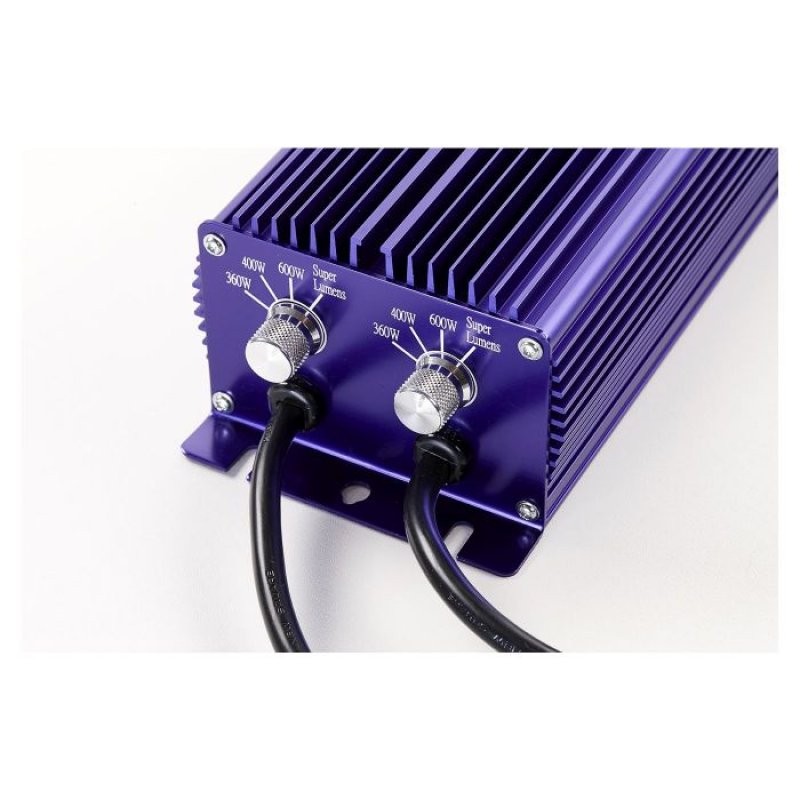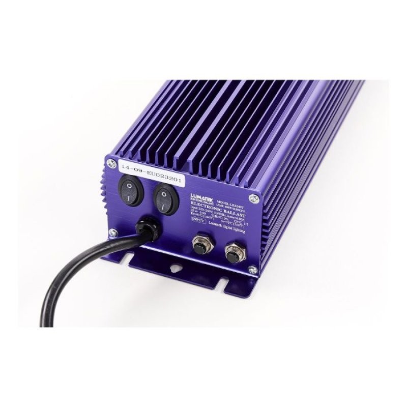 Vysokofrekvenční digitální předřadník Lumatek Twin 600W 240V s čtyřpolohovou regulací garantuje kontrolu světelného výkonu na úrovních 250W-400W-600W-600 Super Lumen (v procentech 50%-75%-100%-110%). Včetně IEC konektorů.