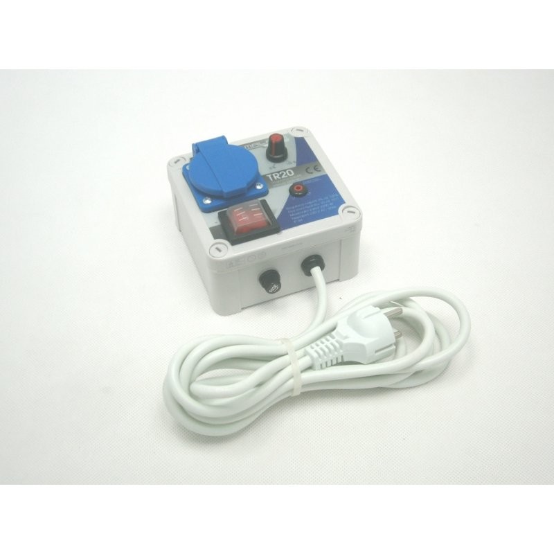 Kvalitní plynulý regulátor/ stmívač pro indukční i odporové spotřebiče o výkonu od 1do 2200W. Zvyšování nebo snižování výstupního napětí se provádí hlavním otočným knoflíkem, druhý menší knoflík slouží jako spodní zarážka (níže). Regulátor má integrovaný hlavní vypínač s LED indikací.