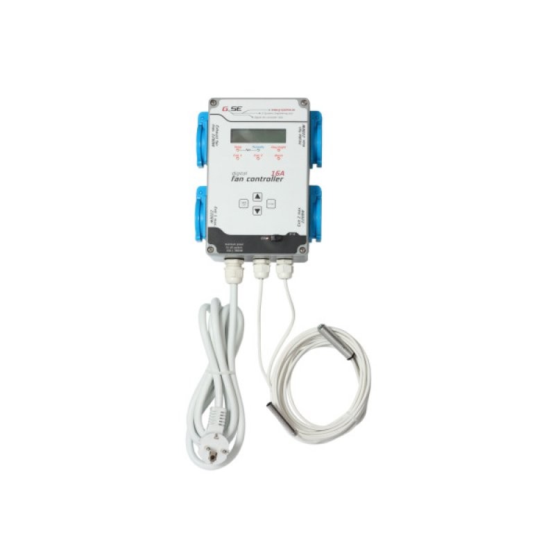 Digitální regulátor Fan controller GSE, 16A/4x2200W je určen k důkladné kontrole teploty a vlhkosti v uzavřeném prostředí pomocí více ventilátorů. Každá zásuvka zvládne max. příkon 2200W, celkový příkon na přístroj nesmí přesáhnout 3600W.