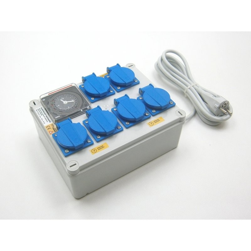 rozdělení zásuvek: 4x spínaná zásuvka ovládaná spínacími hodinami pro osvětlení (každá zásuvka max. 1x 1200W nebo 2x 600W) 1x spínaná zásuvka noční ovládaná spínacími hodinami (max. 3000W) 1x nespínaná zásuvka, pod trvalým napětím
