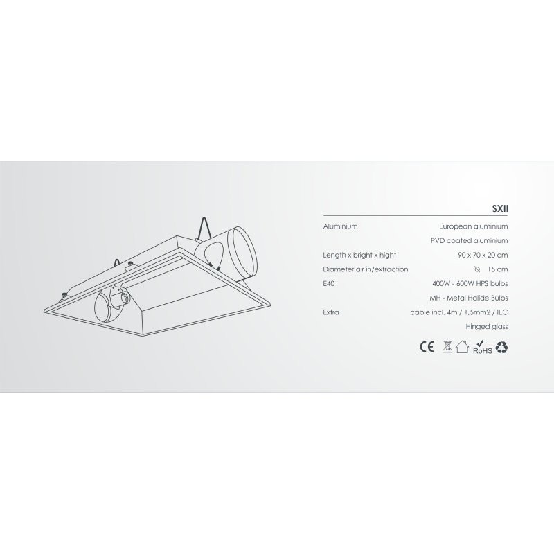 Stínidlo SXII z prvotřídního hliníku s rozměry 90x70x20cm. Průměr odtahu/přítahu 15 cm. Cooltube stínidlo do lamp 400-600W.