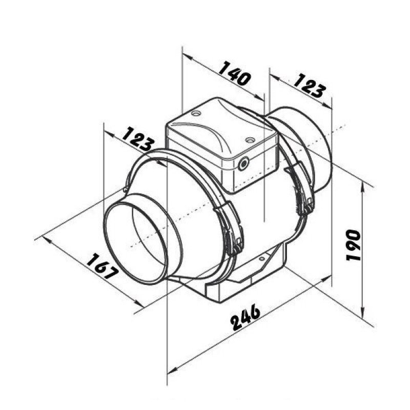 Plastový potrubní ventilátor TT 125 s dvourychlostním jednofázovým motorem s kuličkovým ložiskem. Nízká hmotnost, minimální hlučnost.