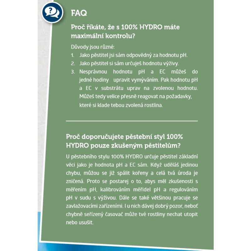 Koncentrované hydroponické hnojivo obsahuje živiny v dobře rozpustné a pro rostliny rychle vstřebatelné formě. Obě složky používáme po celou dobu živení a ve stejném poměru. Hydro A obsahuje kromě dusíku a draslíku (NPK=5-0-2) ještě vápník. Hydro B dodává rostlinám i fosfor (NPK=2-5-9)