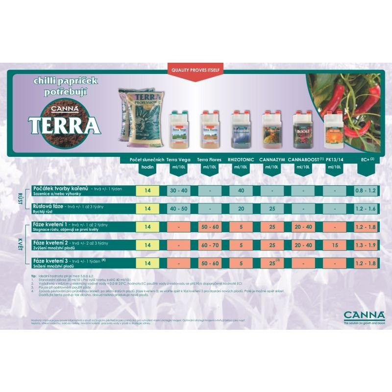 Životně důležité postranní výhonky a bujný kořenový vývoj charakterizují zdravý, silný růst a vytváří základ pro velké sklizně. Canna Terra Vega, 10L byla vyvinuta, aby vyhověla požadavkům rostliny během fáze růstu. Celková absorpce vody a dávkování od začátku pěstování je také zaručena, protože Terra Vega je bohatá na dusíkaté sloučeniny, které mohou být přímo absorbovány, vysoce hodnotné EDDHA železné cheláty a stopové prvky.
